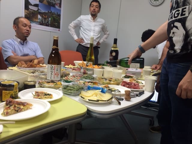 大阪オフィスの女性陣が力をあわせ用意した、手作りのキッシュ、ワカモレ、トマトの和え物、ジャーマンポテト、チキンときのこのクリームソース和えなどなどたーっくさんのおかずにみなで舌鼓。