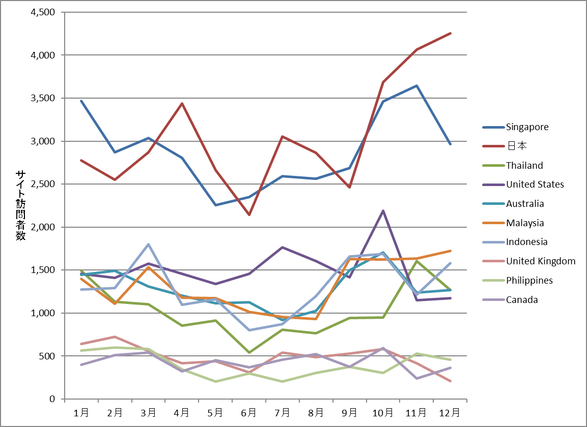 また、[表2]「白川郷ページにおける国別アクセス数」をみると、東南アジア圏(シンガポール・タイ・マレーシア・インドネシア・フィリピン)からのアクセス数は冬が高く、夏が低い傾向にあります。対照的に、欧米圏(アメリカ・イギリス・カナダ)からのアクセスに関しては、お花見、紅葉シーズンにピークを迎え、冬のアクセス数が低い傾向にあります。
