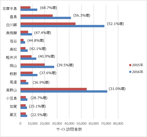 最後に全体の傾向として各エリアに共通するのが「Transportationページ」へのアクセス数の増加についてです。都道府県ランキング上位にランクインした県のなかでも「Transportationページ」への増加率は高く、特に「祖谷」「直島」「志摩半島」「白川郷」の各交通ページはすべて対前年度比150%以上で、個人旅行客が増加していることが主な要因として考えられます。