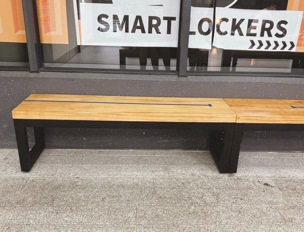 私の住んでいる街(台南)のバス停でも、入場前に乗客全員の検温を行っています。中の待合席にもソーシャルディスタンスを保つよう、印が貼られていました。