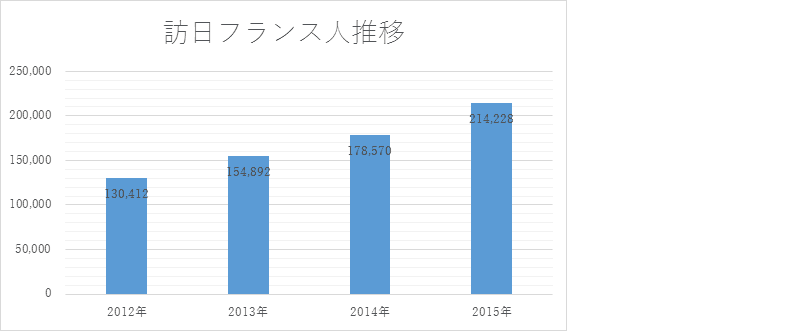 訪日フランス人の全体的な数値増加は、JNTOからの資料からもわかります。
