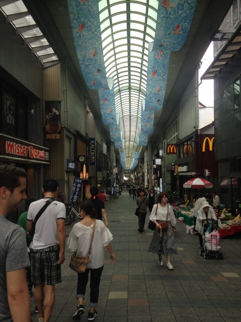 商店街はガラスの屋根で覆われていて、看板などがあるので夏祭りみたいな雰囲気がしました。商店街はたくさんのお店があったので、お土産を探すのにいい場所だと思います。