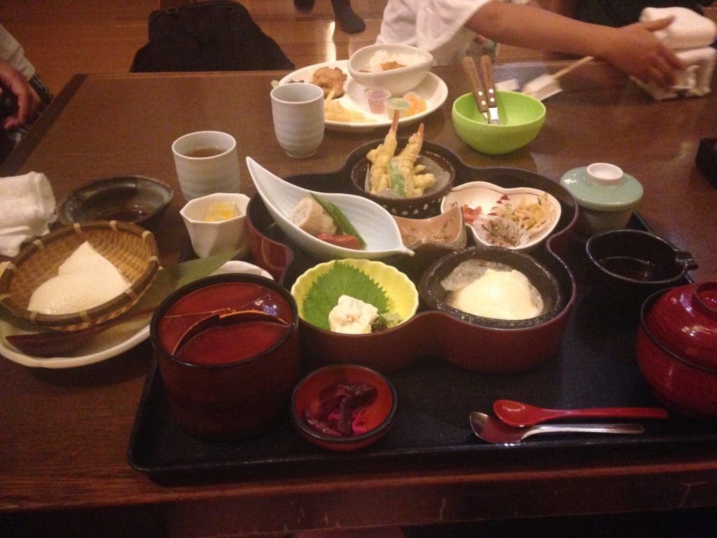 私たちはある人に聞いて、京都の伝統的な食べ物を提供している大きなレストランを教えてもらいました。日本では小さな器にたくさんの種類のおかずを盛ってだされるのを知っていたけど、写真をみたらわかるようにほんとに多すぎ!テーブルは食べ物だらけになっちゃった。私はほとんど何が何なのかわからなかったけど、どれも悪くありませんでした。もちろん、私が慣れ親しんでいるものとはぜんぜん違うけど。