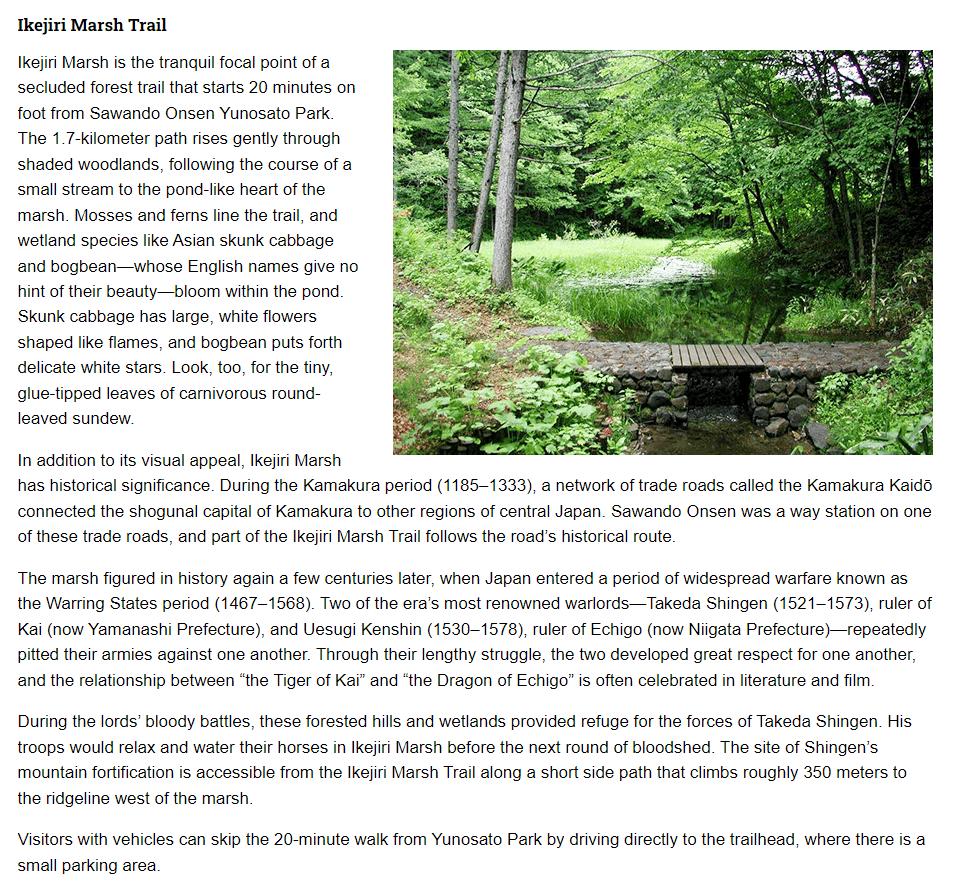 (下記は中部山岳国立公園南部地域 英語Webサイトより、一部の解説文、「Ikejiri Marsh Trail」のご紹介。)