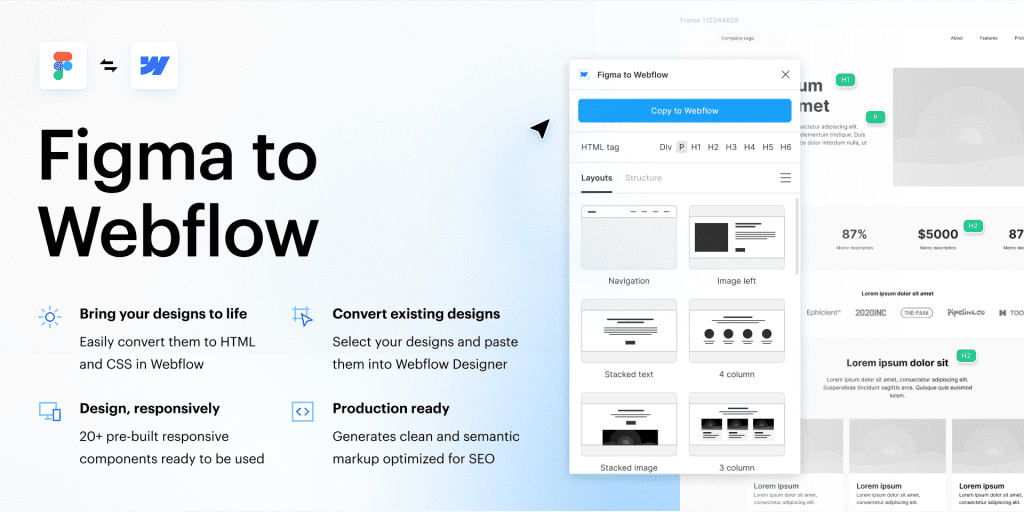 FigmaからWebflowに移行するためには、専用のプラグインでもう一度デザインを組み立てる必要があります。プラグインはこちらです(無料)。