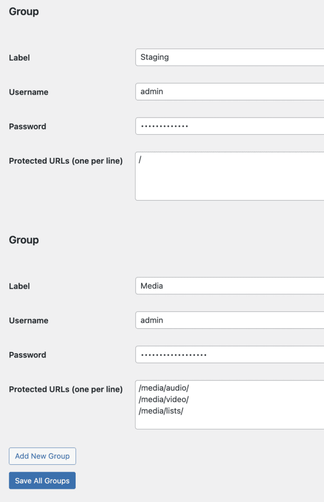/media/list/, /fr/private-page/)template_redirect/wp-content/plugins/..htaccess .htpasswd files automatically.The plugin uses two layers of protection to ensure your specified URLs are secure. Passwords are securely hashed using BCRYPT before writing to .htpasswd-groupname