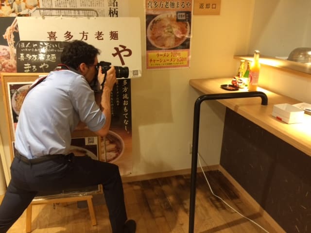 取材当日はお店が閉店した後に集合し、キャンペーンに関連する商品の撮影から始まりました。ちょうどよい照明を見つけて写真を撮るジョー。