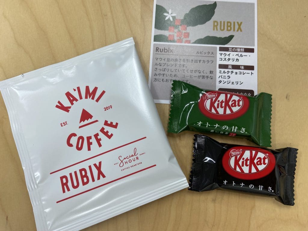 ちなみに、勉強会の開催日までに準備したことも書いておきます。まず、Ka’imi Coffeeのディップスタイルコーヒーを参加者全員分、大阪オフィスに郵送してもらいました。そして、そこから私が参加者の自宅宛てに郵送手配しました。コーヒーだけを送るのはちょっと遊び心がないなと思ったので、キットカットのおやつもつけましたよ。ちょっと贅沢に「オトナの甘さ」レギュラー味と濃い抹茶味をセットにしました。「贅沢ですね。」