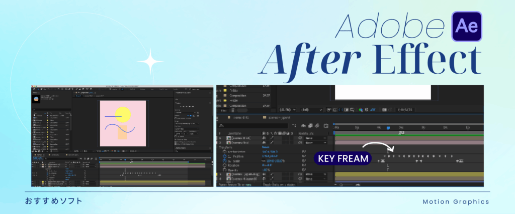 モーショングラフィックスの作成手順を説明する前に、モーショングラフィックスを作成するために私がおすすめするソフトウェアを紹介します。それはAdobe After Effects(AE)です。Adobe社によって開発されており、モーショングラフィックスやアニメーションを作成するためのソフトウェアです。