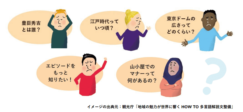 日本人がもつ前提知識は外国人旅行者には当てはまらない場合が多く、補足説明が必要であったり難解すぎる表現は改めたりするなど工夫が必要です。また、訪日外国人旅行者の興味・関心を把握する必要もあります。