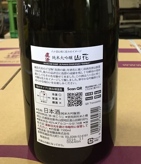すでに国内で高い評価を受けている日本酒メーカー、真澄蔵元では、製品の外観を損ねることなく、ボトルの商品説明部分にQR Translatorを配置して頂き、読み取った人に対して、どういった想いで酒造りがされているのか、また、その原材料となるお米はどういった環境で栽培されているのかの情報を、英語、フランス語、繁体中国語で伝えられるようにしています。