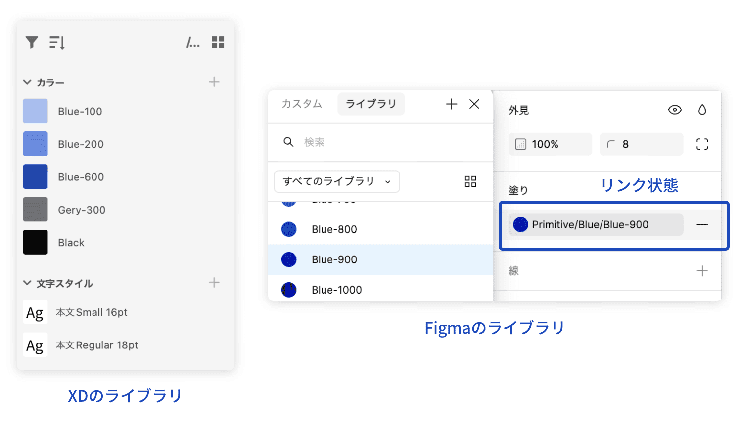 ※ XD、Figma両方にある機能ですが、Figmaではオブジェクトの色がライブラリとリンクされているかどうかの表示があり、より確認しやすいです。