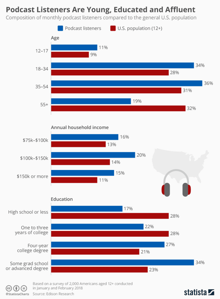 ポッドキャストを聴いている人の多くは大卒以上で、ホワイトカラーの仕事をしています。つまり、ポッドキャストの聴者はある程度の知識層が中心であると言えます。