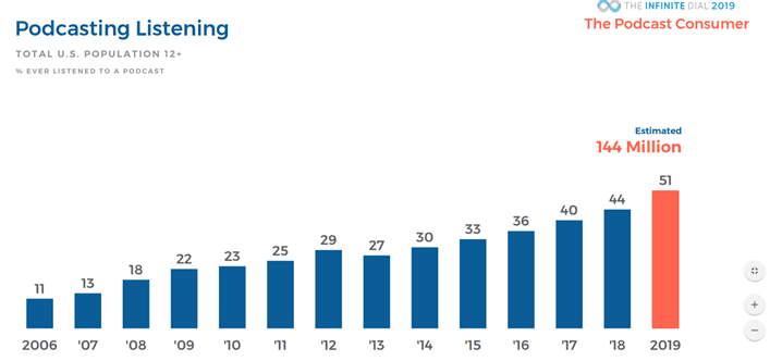 グラフ中の角棒の上の2桁の数字は、アメリカの12歳以上の総人口のうち、今までポッドキャストを聞いたことがある人のパーセンテージ。右上の144 million (1.44億)という数字は、そのパーセンテージから導き出した今までポッドキャストを聞いたことがある人の数。