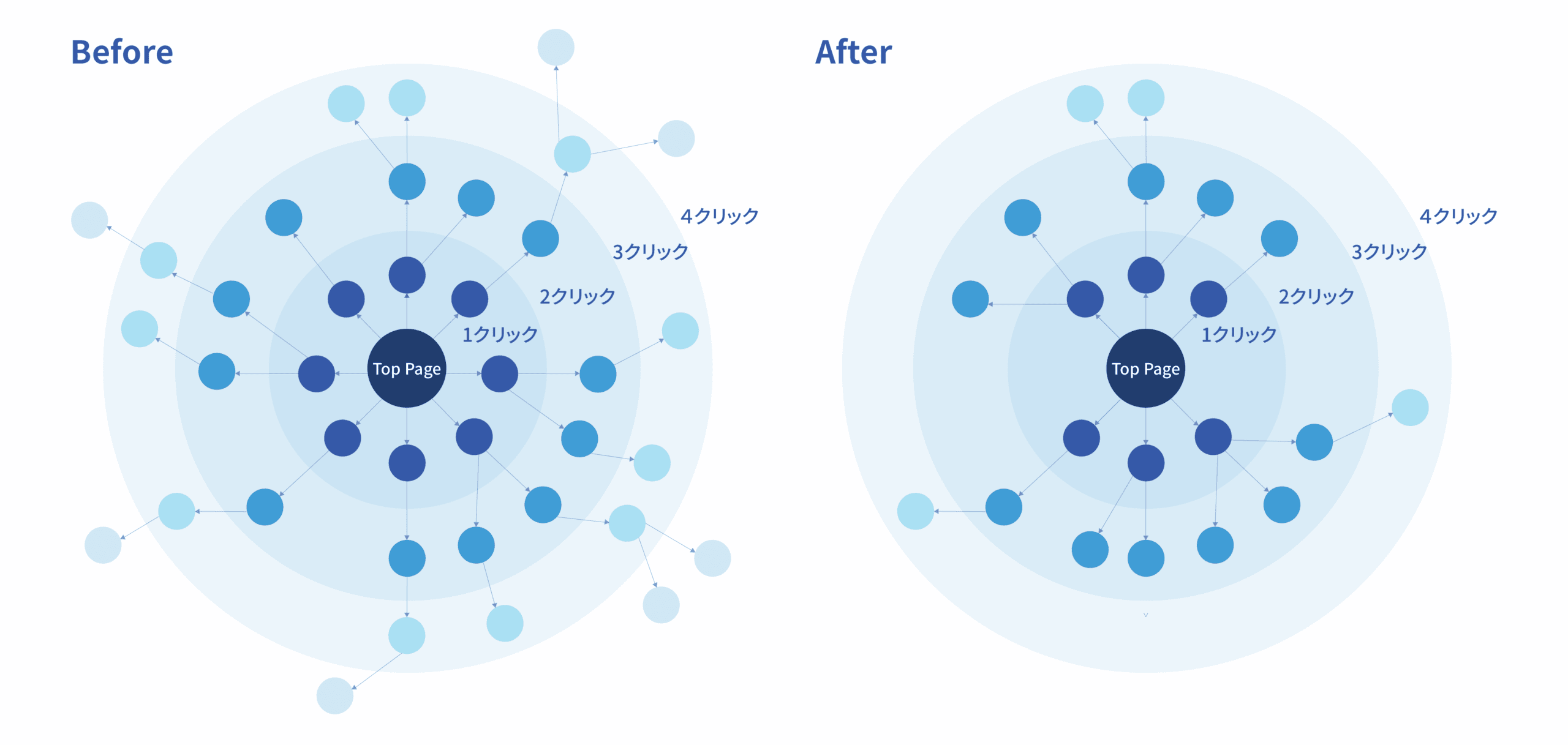 また、サイトマップ作製の際は、ユーザーの誘導を中心に考えてサイト内のナビゲーションを作成します。上の図にあるように、ユーザーが目的とする情報に辿り着くまでに4クリック以上かかっているページや、どこにもリンクされていないページを洗い出します。それらを整理して、すべてのページが3クリック以内で閲覧できるよう、サイトの改善案を作成します。